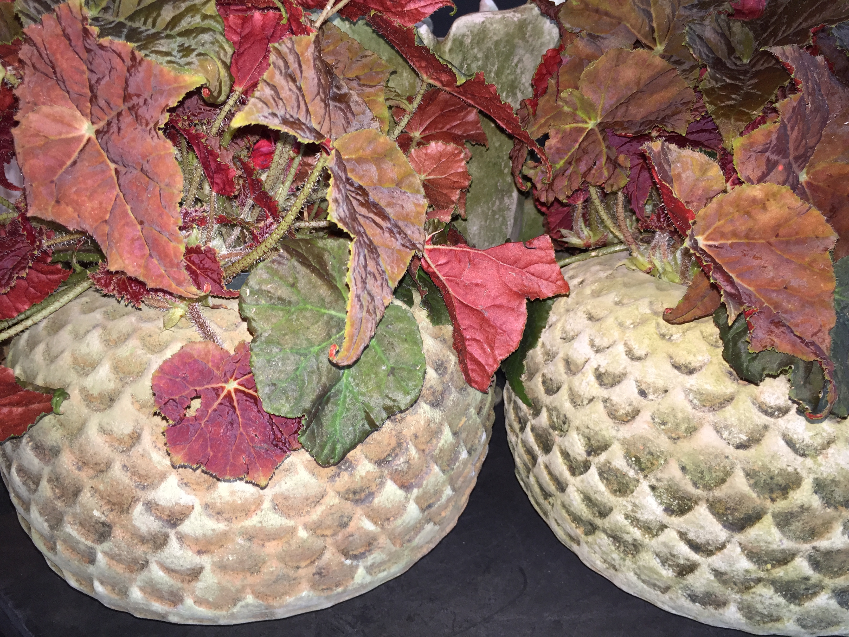 beautiful ‘aged terra cotta’ planters from campo de fiori…shown with begonia ‘autumn ember’ – in the light the leaves on this plant ring rich and coppery